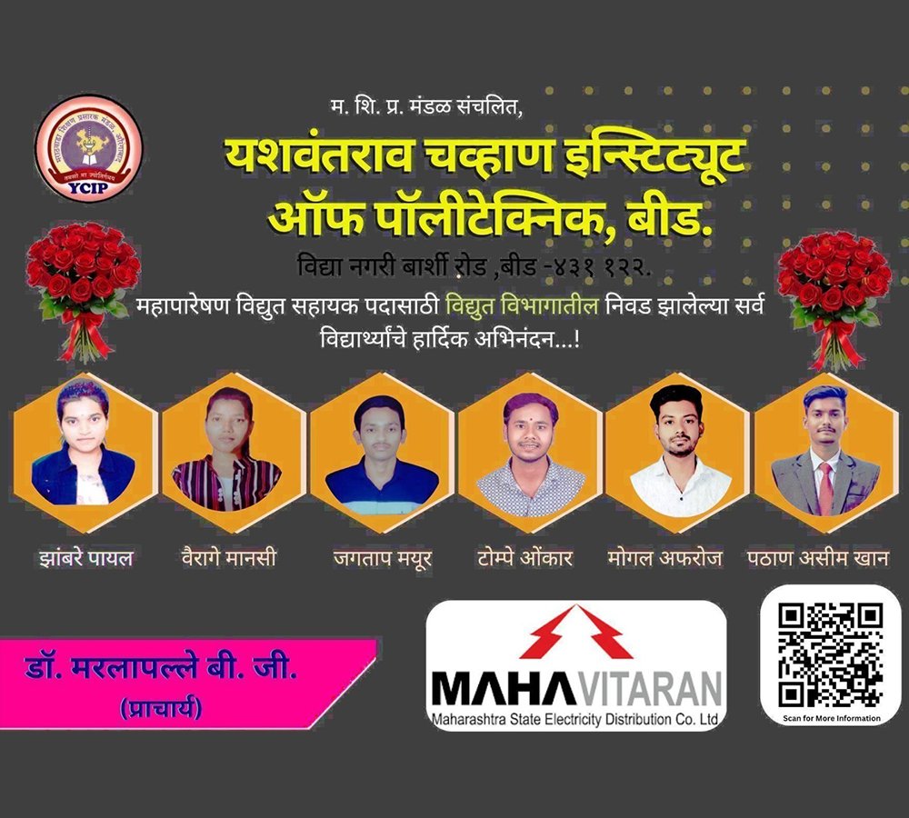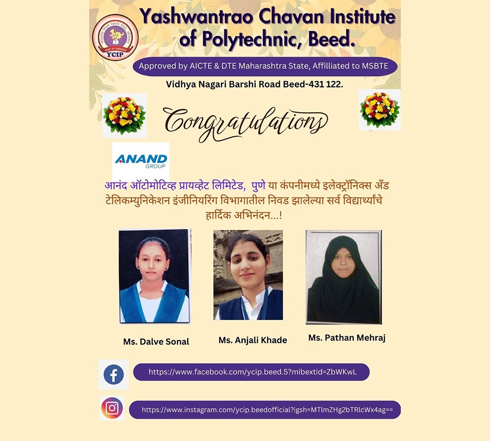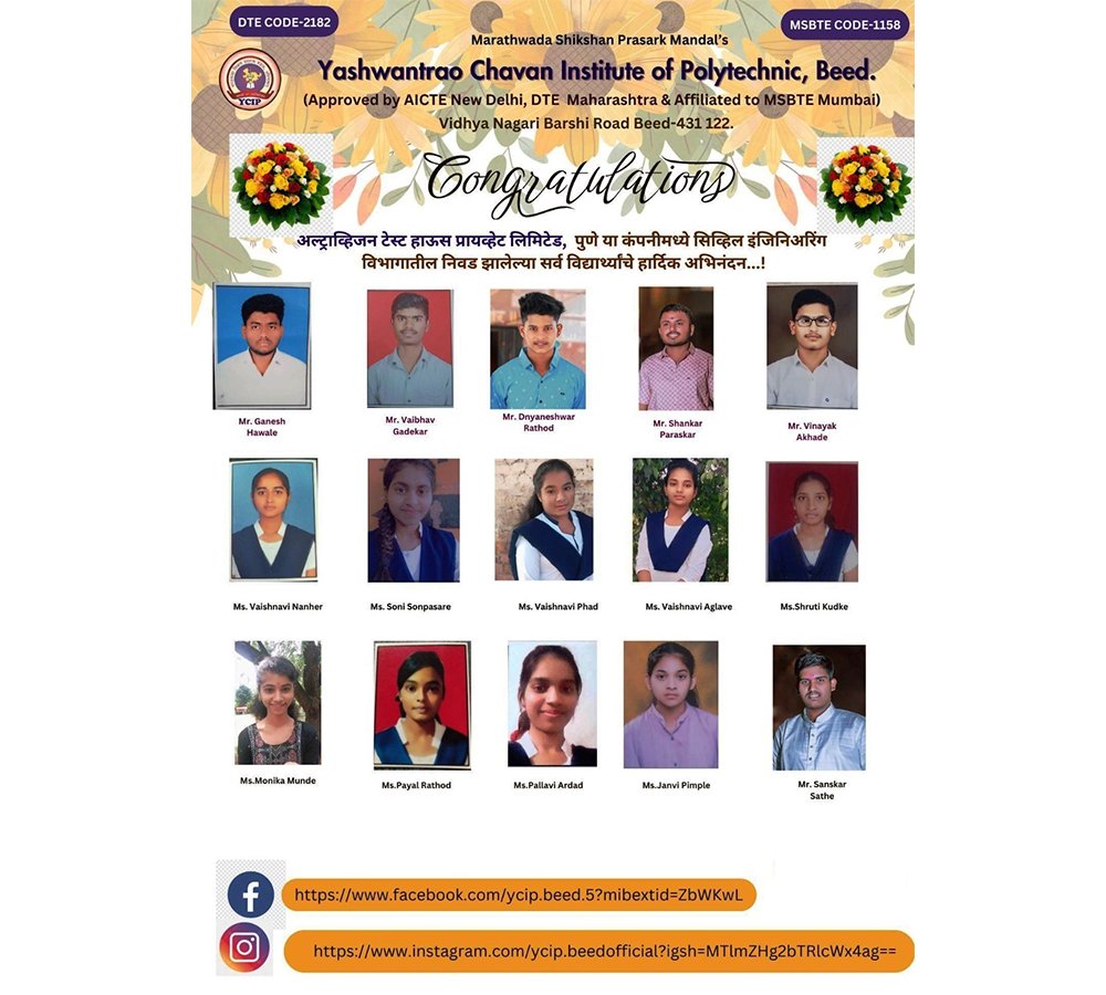 We, at YASHWANTRAO CHAVAN INSTITUTE OF POLYTECHNIC, BEED being recognized institute are committed to have latest technical skills and knowledge for the diploma in Engineering field.